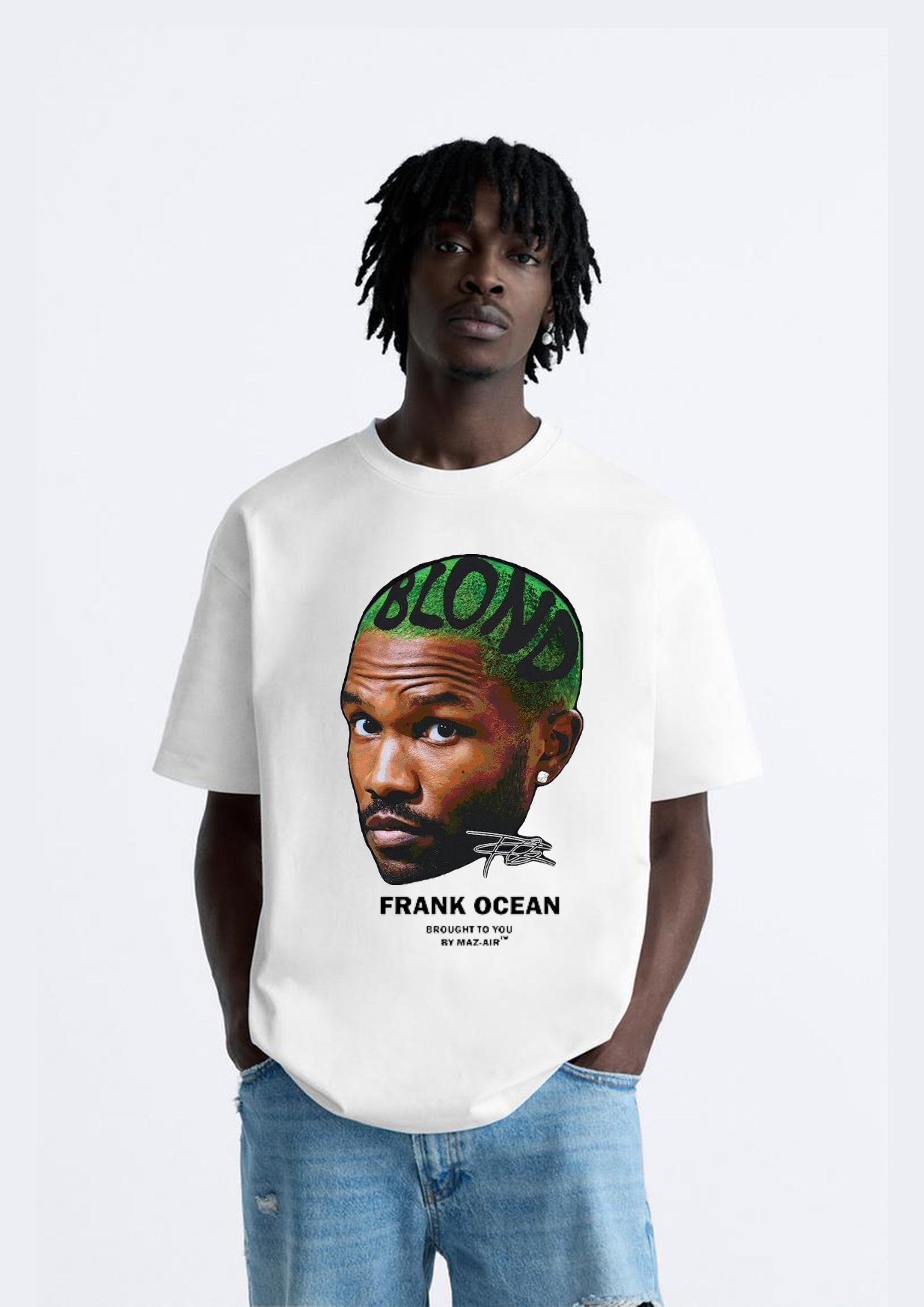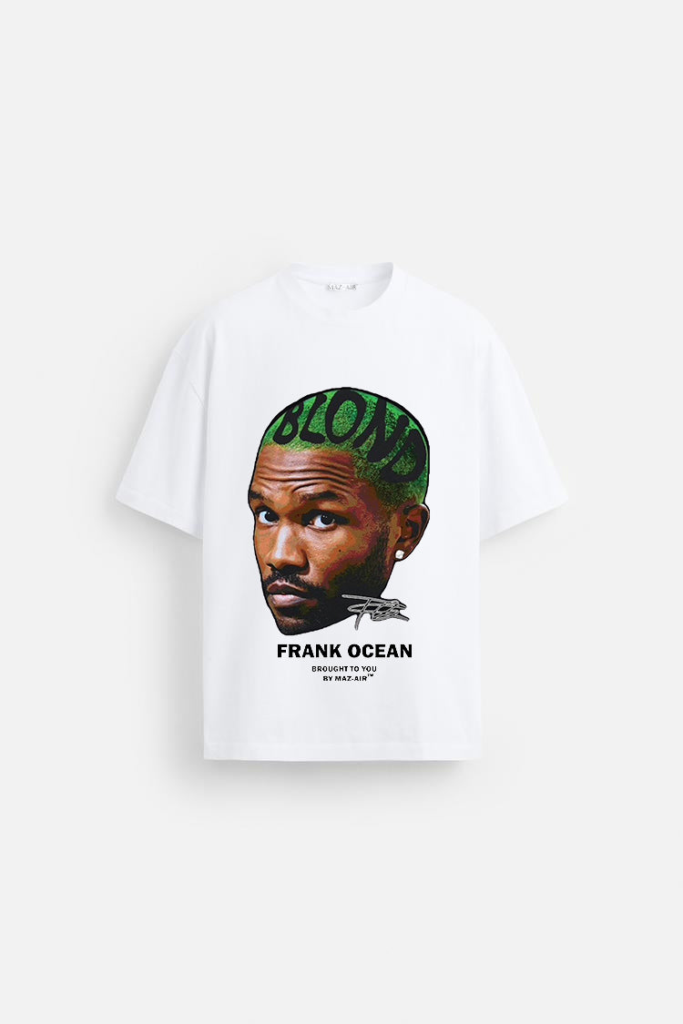 This limited edition tee from MAZ-AIR™ pays homage to the enigmatic Frank Ocean — a generational voice and visual legend. Featuring a bold portrait with the word “BLOND” cut into his green fade, this piece captures an era that changed music forever.
