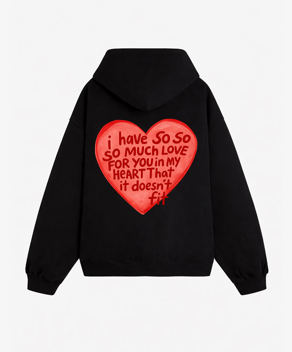 This hoodie speaks from the heart. The “Overflowing Love” hoodie from MAZ-AIR™ features a hand-painted heart and a message that says it all: "I have so so so much love for you in my heart that it doesn’t fit." A vibrant expression of love and affection, this piece is perfect for those who wear their hearts on their sleeves — or in this case, their backs.